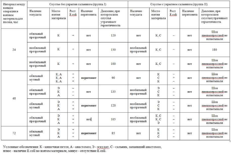 В различных вариантах опытов: 1) на кроликах с применением антимикробных препаратов (во всех остальных сериях опытов, выполненных на собаках, антимикробные препараты не применялись), 2) в 24- и 48-часовых опытах на тонкой кишке (табл. 1), 3) в 24- и 48-часовых опытах на толстой кишке (табл. 2), 4) в почасовых опытах на тонкой кишке (табл. 3) обнаружена однотипная картина. Во всех этих опытах в послеоперационном периоде наблюдалось инфицирование брюшины при использовании общепринятого двухрядного кишечного шва. Инфицирование это было достаточно велико, так как из 16 опытов, в которых был двухрядный шов без укрытия сальником, в 6 (48%) опытах развился перитонит. В то же время в опытах, в которых был применен однорядный серозно-мышечный шов с оментизацией, микробов в брюшной полости не было. Таким образом, обнаружен неизвестный ранее источник инфицирования брюшины, ведущий в эксперименте и клинических условиях к развитию различных бактериальных осложнений: перитониту, спаечным осложнениям и др.